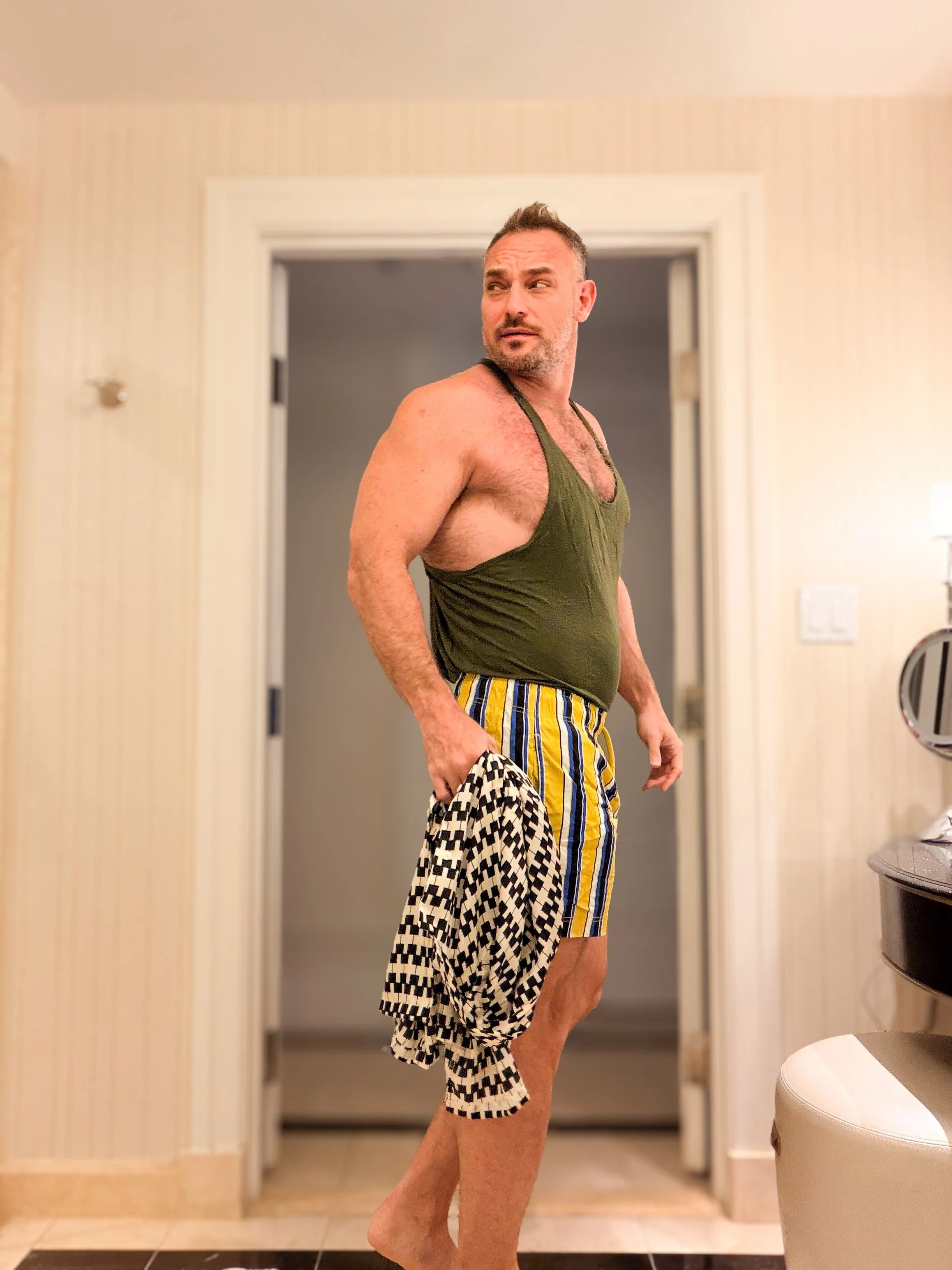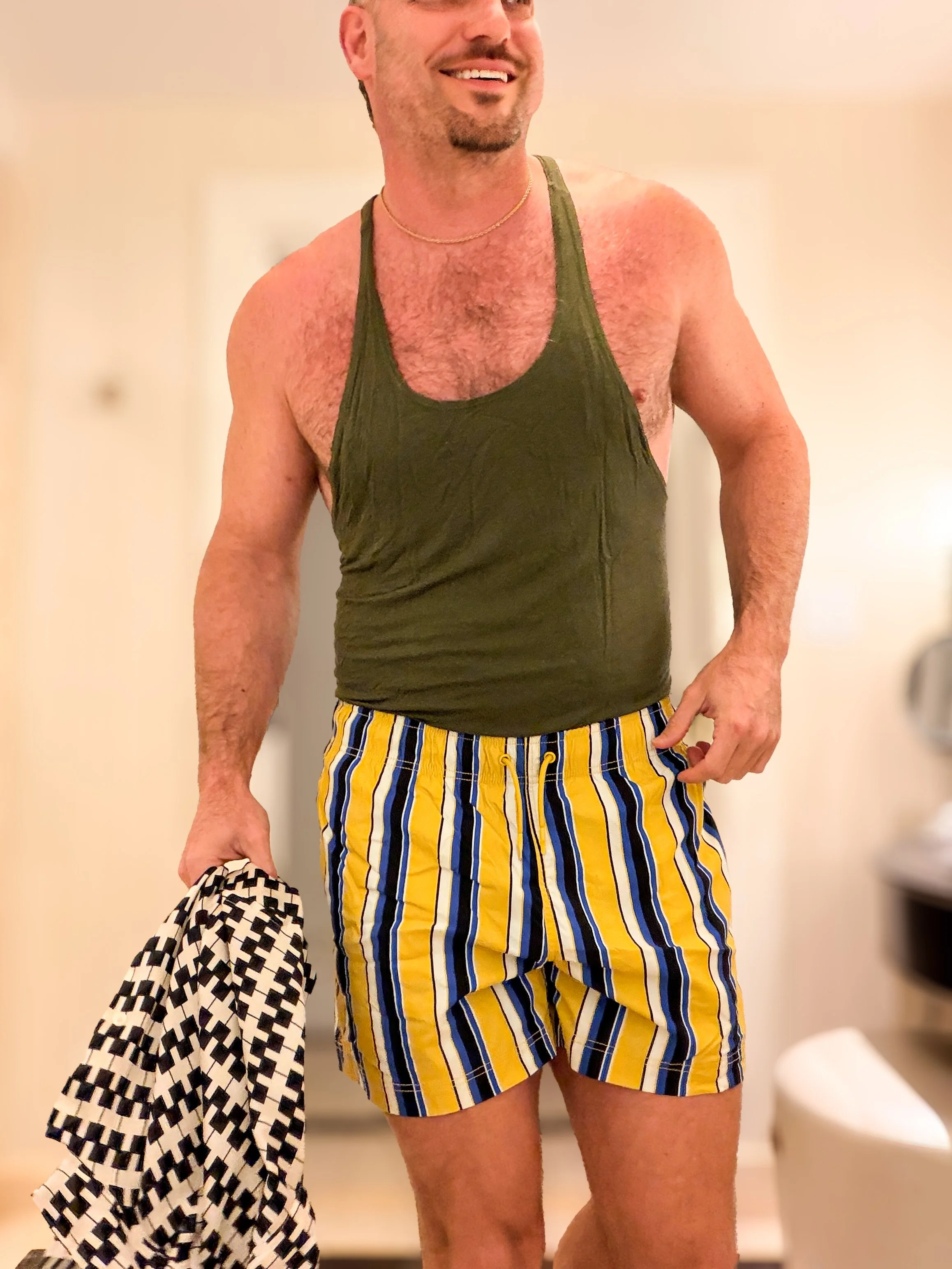 The geometric shirt brings structure. The striped shorts bring chaos. The olive tank steps in like a neutral mediator saying, “Everyone relax, we’re all on vacation.”